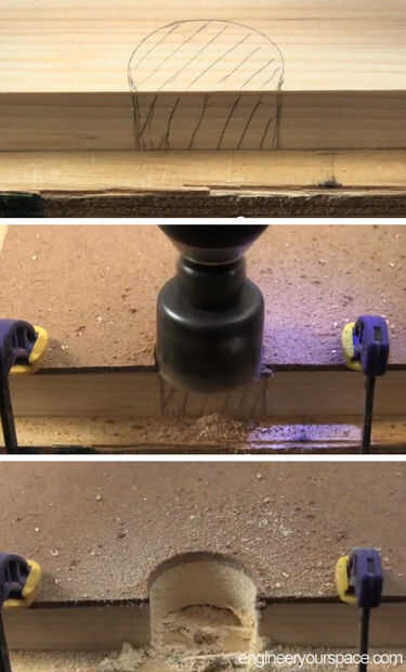 Taladre un orificio semicircular en el centro de la parte superior e inferior tablero usando que vio un agujero de diámetro ½" 1. Con abrazaderas un pedazo de madera encima de la mesa antes de hacer el agujero le ayudará a hacer un corte más limpio. Los cables de los dispositivos que está carga saldrá del agujero superior y el agujero inferior es para el cable de la tira de la energía a la salida.