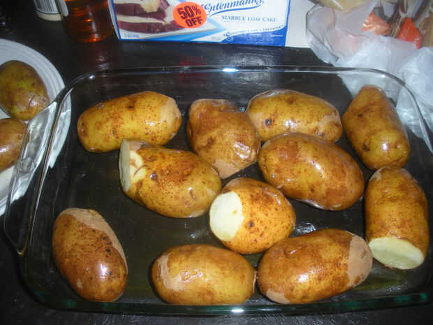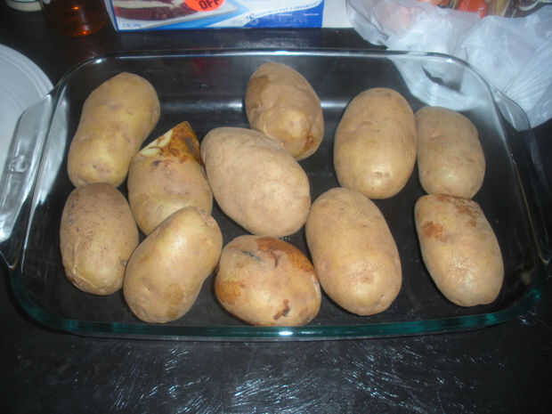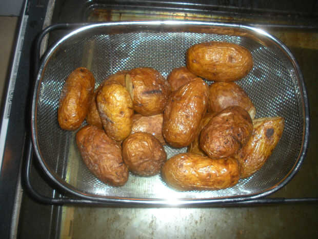 Lavadas y cortadas las papas luego microondas durante 12 minutos y dejan enfriar hasta que pude manejarlos. Una vez fría para manejar les di una capa de aceite de oliva y una pesada gota de sal. Entonces colocaba en un horno de 350 grados fahrenheit durante unos 15 minutos a crujiente la piel un poco