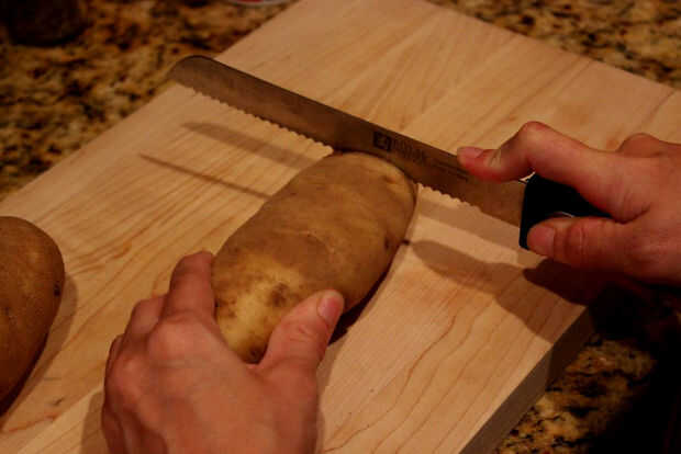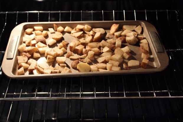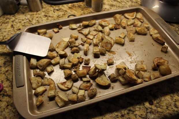 OK, todo el mundo sabe que para hornear papas, deben cocinarse primero. Esto puede tomar mucho tiempo. Para acelerar el proceso, dados mis patatas crudas, había espolvoreado con sal y pimienta y cocinarles en 400 grados durante unos 20 minutos.