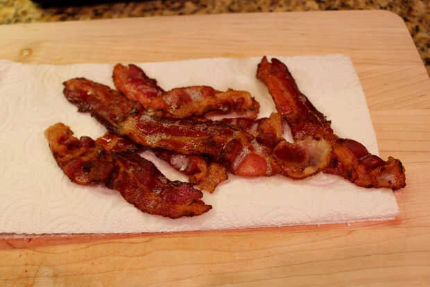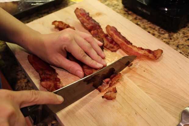 Mientras tanto como las patatas son refrigeración, empezar a cocinar el tocino. Esto debe tomar una rápida 10 minutos o menos. Asegúrese de que la hornilla está en posición media alta. Bacon se realiza cuando están crujiente olor increíble! Sacarlos de la bandeja, utilice un buen cuchillo (o las manos si son diversión fresco, yay!) y desmenuce el tocino y apartar.