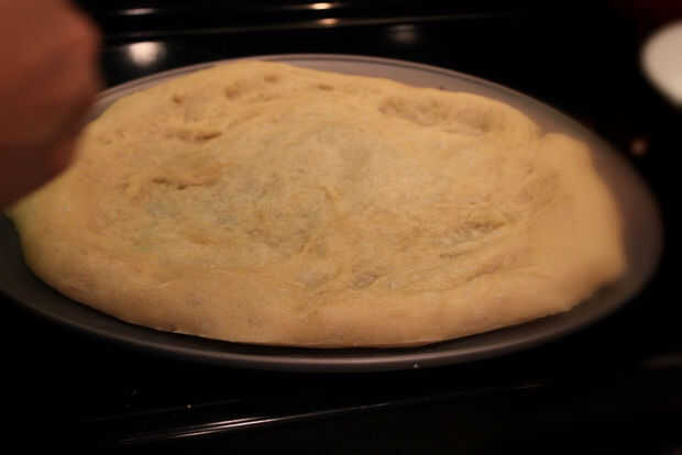 tossin' tiempo la masa de pizza! Las manos de harina y mezclar la masa alrededor en el aire. O usted puede simplemente colgar a estirar la masa al tamaño deseado de su pizza. Tenía un buen rato, casi caído it... sabes el precio. Hacer esto hasta que la masa es el tamaño deseado. Luego con las manos tratar de y hacia fuera de los bordes del molde. Esto es lo que será la corteza. Si usted quiere una corteza más gruesa del borde, luego moldearla de esa manera. No necesita ser perfecto. Pop en el horno a 400 grados durante 5 minutos. Esto hace que el aumento de la masa y hasta quebradizo. ~ Crispyyyy Yum