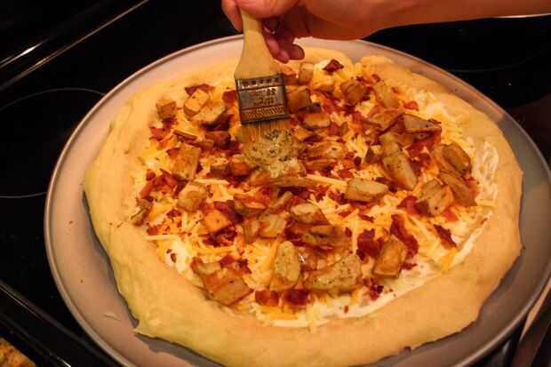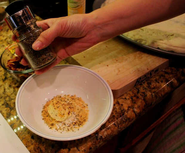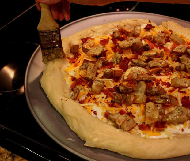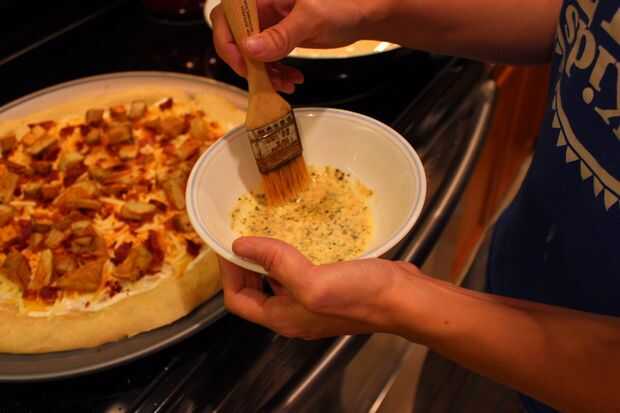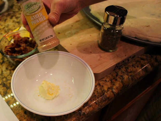 Derretir la mantequilla en el microondas en un bol mediano. Sin ningún orden en particular agrega el orégano, aderezo italiano, ajo en polvo y revuelva. Cuando esté listo, tome un desbastador o una cuchara y rociar la mantequilla encima de la pizza principalmente donde están las patatas al horno. Luego tomar la mantequilla restante y difunda en la corteza. El olor es fenomenal!!