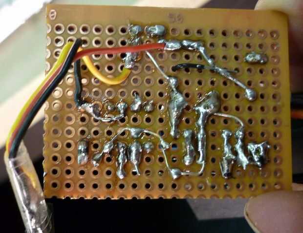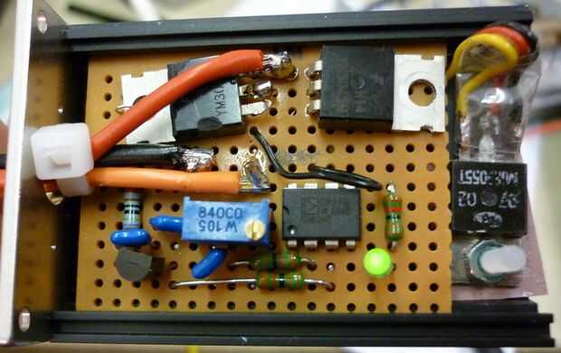 Una caja se desconecta células solares cuando el voltaje de la batería se convierte en 13V. Construcción se realiza mediante una placa de prototipos.