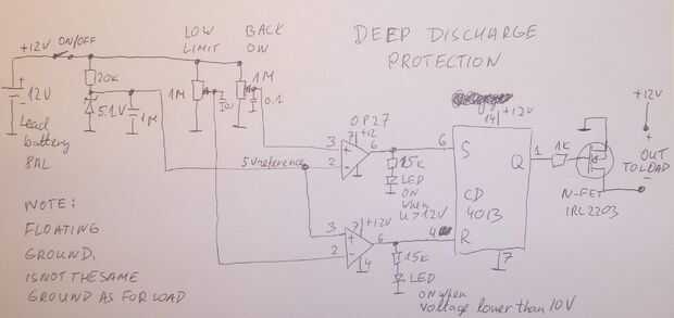 Otra caja negra protege batería de descarga profunda. Desconecta la carga cuando la tensión disminuye por debajo de 10V y lo nuevo cuando la tensión aumenta por encima de 12 que v. el énfasis está en baja descarga inactivo actual tha tis 5 mA.