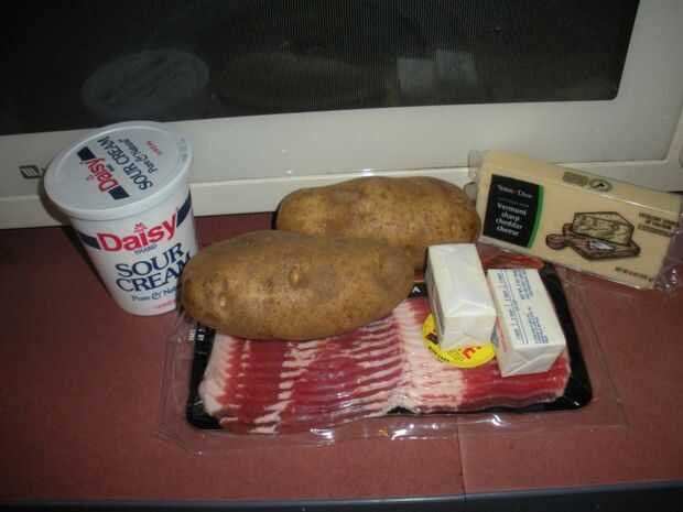 usé una bolsa de 5lb de papas de la hornada 2 libras de tocino 2 trozos grandes de queso 2 medio envases de crema agria 1 taza de mayonesa (no se muestra) 2 1/2 barritas de mantequilla