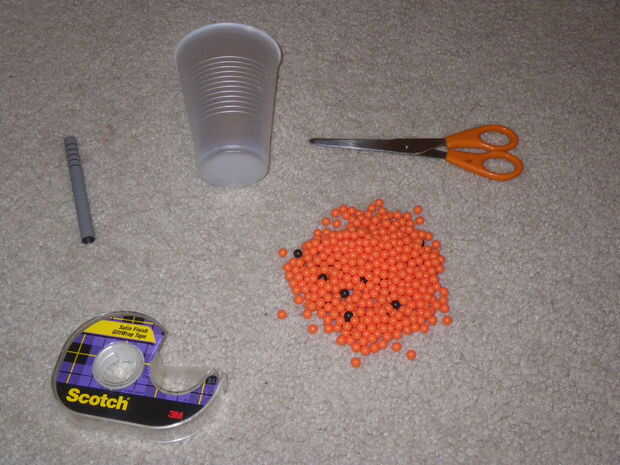 Necesita tijeras, cinta, un vaso de plástico, de bb y un tubo de bolígrafo