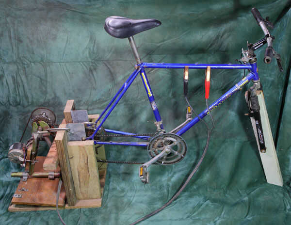 Este es un proyecto para generar cantidades prácticas de energía eléctrica mediante el uso de pedales de bicicleta. Terminé usando tres etapas de la cadena para conducir un motor de corriente continua como generador y cargar una batería de coche. El uso de cadenas resulta para ser durable y eficiente. Los diversos tamaños de la rueda dentada le permiten elegir la velocidad que usted necesita para el motor que tienes.