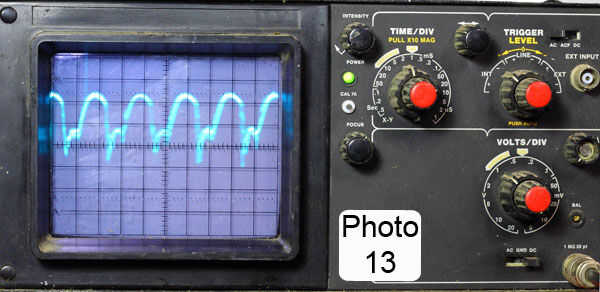 Foto 13 muestra un rastro de osciloscopio del 10% de la producción que es corriente directa pulsante. La frecuencia del pulso depende de la tasa de velocidad del eje del motor. Tienes que ajustar tus cadenas para dar la velocidad de pedaleo más cómoda por la salida que desea producir.