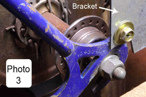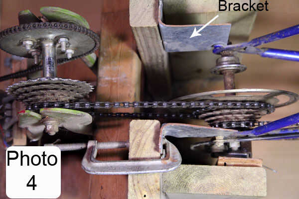 Fabricar los soportes en L y sujete a la parte trasera de la moto. Luego fije los soportes en el soporte con tornillos. Foto 3 y 4 muestran esto. Prueba el eje trasero para asegurarse de que la cadena salte de la rueda dentada que desea utilizar.