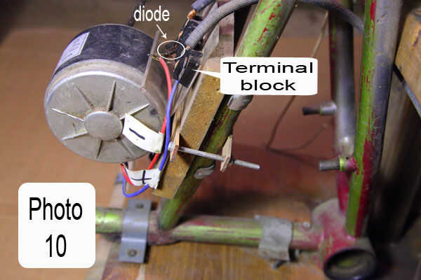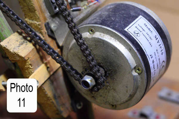 Corte una 6 x 6 x 3/4 pulgada tablero para montar el motor y un bloque de terminales para las conexiones a la batería y diodo. Diseñar un arreglo de abrazadera para que la posición del motor es ajustable para ajustar la tensión de la cadena y alineación. Ver foto 10.