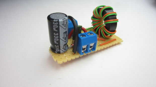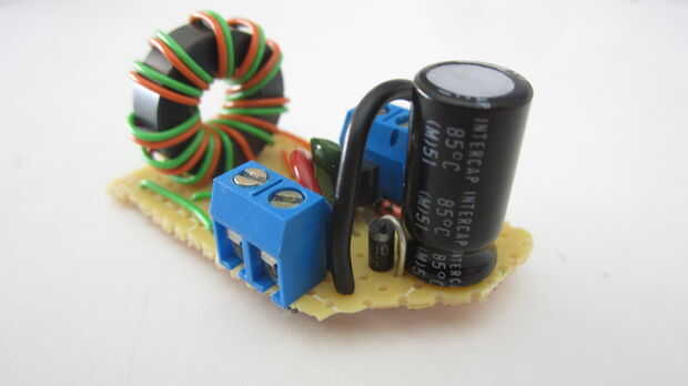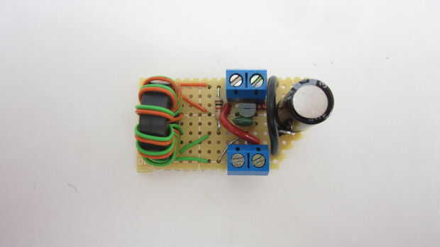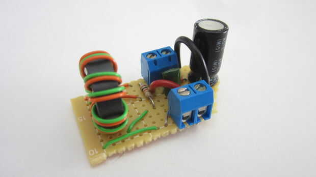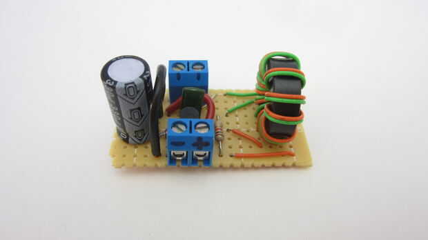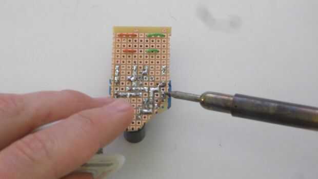 Para hacer el circuito terminado tan pequeño como sea posible, soldado las piezas sobre un tablero de perf. Este tipo de circuito permite colocar los componentes en cualquier lugar en el tablero que quieras y realizar conexiones personalizadas entre ellos en la parte inferior. Cuando terminé de soldadura, cortado la Junta alrededor de los componentes.