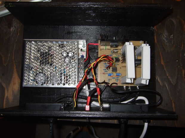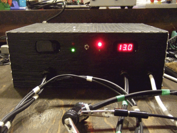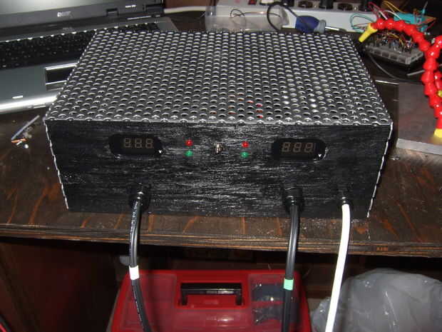 El diseño, que se encuentra en madera y aluminio perforado, se basa en un microprocesador ATtiny85. Para la programación usé un Arduino como ISP y el entorno de programación de Arduino. Se hacen las conexiones a las baterías con conectores de tipo encendedor de cigarrillos. Dos entradas analógicas de la ATtiny85 se utilizan para monitorear la tensión de dos pilas. Se utilizan dos salidas digitales para interruptor de encendido y apagado de carga de hasta dos baterías conectadas. Dos voltímetros muestra los voltajes de las baterías conectadas y dos indicadores LED muestran el estado de carga y conexión de las baterías. El dispositivo cuenta con una sola 15V/5A fuente de alimentación que, cuando se conectan dos baterías, ya sea una o la otra batería, asegurando que ni la batería cae por debajo de un voltaje determinado. Por último pero no menos importante, hay un interruptor on/off.