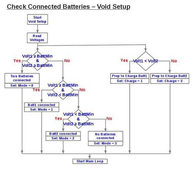Diagrama de flujo de 1 representa el comienzo para arriba y anular configuración se ejecuta sólo una vez. El software asociado con el diagrama de flujo 1 comprueba si las baterías están conectadas por buscando un voltaje mínimo de 1.56 V a ser detectada en la línea de sentido de la batería. = Si se conecta una batería. No = batería no conectada.