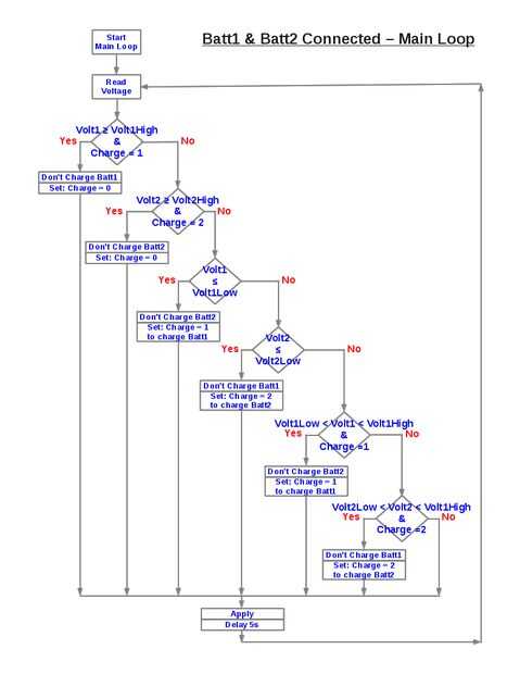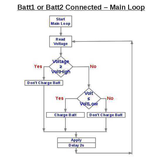 Diagrama de flujo 2 muestra la estrategia para la carga de una batería. La misma estrategia se utiliza para cargar la batería de 1 o 2 de la batería. El bucle se repite continuamente. Primero se lee el voltaje de la batería. Si la tensión es superior o igual a un cierto valor (14.0V) de carga se detiene. Si no se comprueba si el valor es inferior o igual a cierto valor bajo (12.0V). Si es así, se inicia la carga. Un software siguiendo este diagrama de flujo mantener una batería cargada entre el bajo y el alto valor.