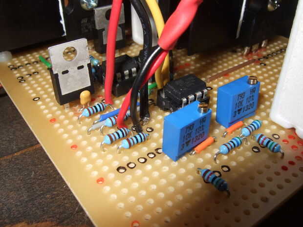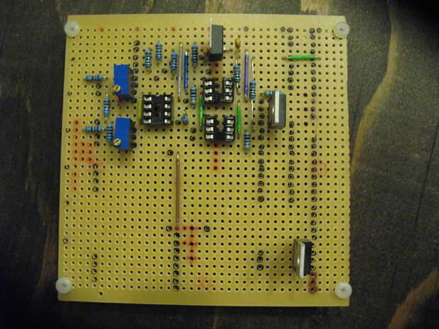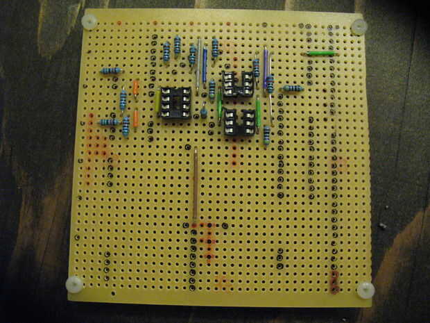 He añadido la resistencias, enchufes de IC, potenciómetro, regulador de voltaje y diodos de la misma manera.