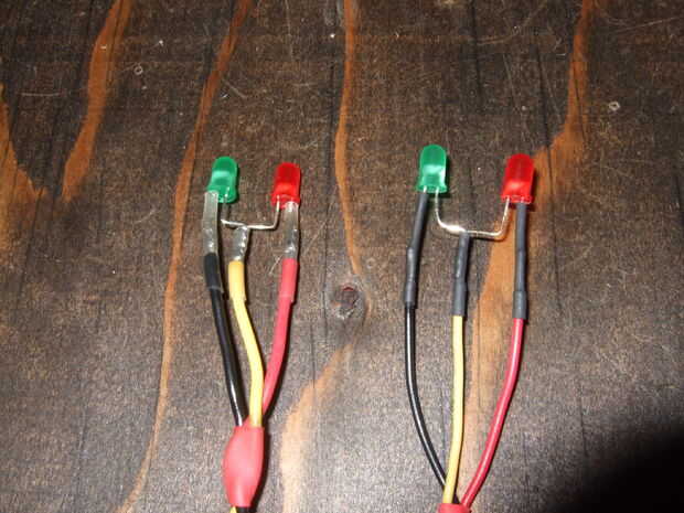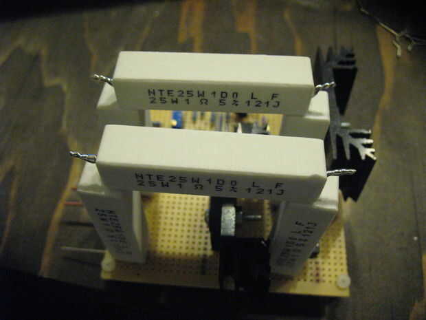 I inserta cuatro de las resistencias de alta potencia en la Junta y los soldados verticalmente sobre el tablero. Posteriormente coloqué las otras dos resistencias a través de un par, trenzados entre sí los cables de las resistencias y había les había soldado. Me la pelaron con cuidado el aislamiento de los cables de LED había premontado, inserta en su lugar y soldado en la placa.