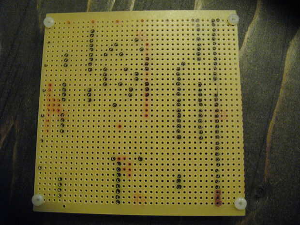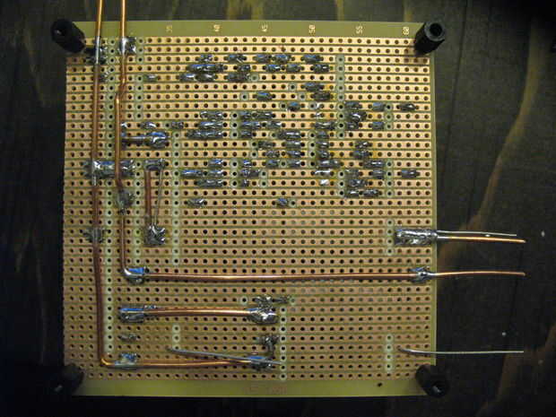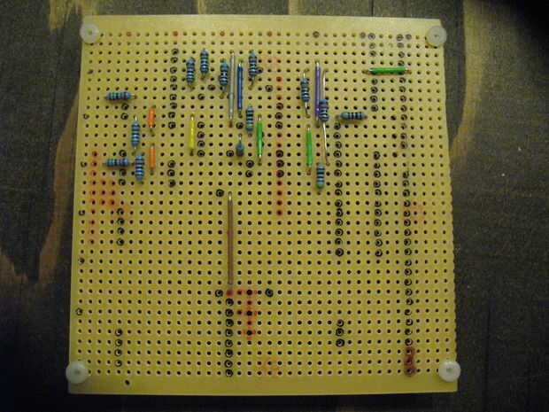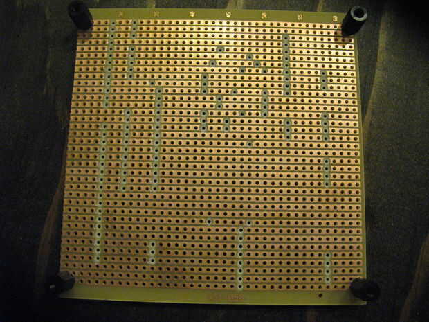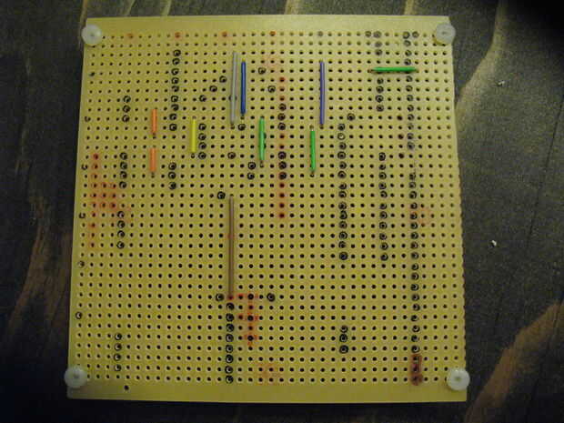 Generalmente construyo encima de una tabla a partir de los componentes de menor altura, a los componentes mayores y mayores. A menudo tiene la ventaja de mantener un mayor número de componentes en su lugar soldar todo al mismo tiempo. I inserta los cables puente en sus posiciones, coloca otro trozo de tablero de la tira en la parte superior y dos juntas alrededor de la vuelta. Los cables no podrían caer de esa manera y pude soldar todos los cables en una carrera.