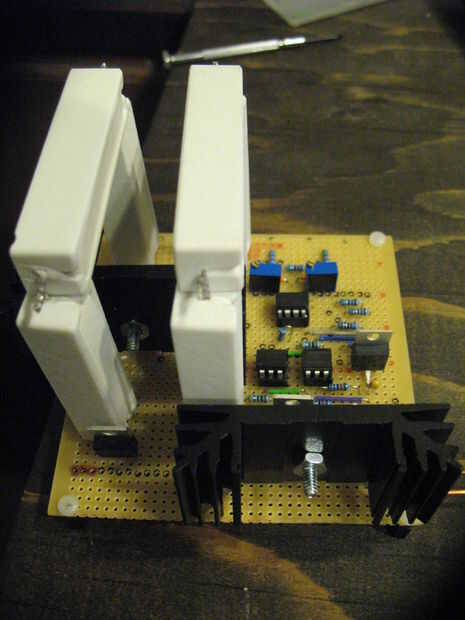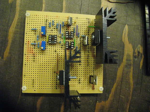 Los transistores tenían piernas de conector que no encajan en el tamaño del agujero estándar de la Junta de tira. Cuidadosamente había medido el diámetro de la pierna y seleccionar la broca adecuada. Usando una prensa del taladro se ampliaron los agujeros para las patas del transistor. A continuación, he probado la pista de los agujeros de shorts a vecino pistas antes de insertar el transistor en los agujeros y soldar en la placa. Tenga en cuenta que los disipadores de calor están conectados a los transistores utilizando pasta de contacto y kits de aislamiento.