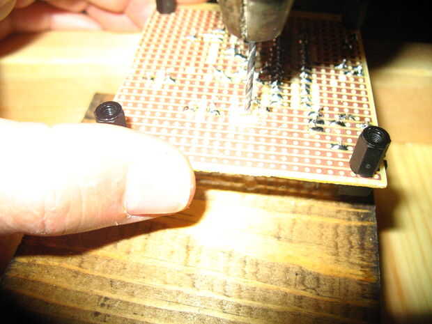 Elegí un taladro de 1/8"(3.125 m) para sujetar los separadores. Los tornillos de nylon fueron M3 (3mm) que hace para un ajuste agradable. Amplió cuatro orificios de esquina donde no tuve ningún conflicto con ninguno de los componentes. Inspeccionar los orificios en el lado de cobre para que no crear ningún cortos y aplicarles.