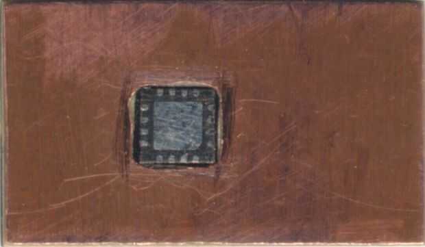 La ic es colocado de manera que su lado de la conexión (el lado con cojines de la soldadura) se alinea con el lado cobre de la Junta y luego se fija en posición con resina epóxica o de tal pegamento.