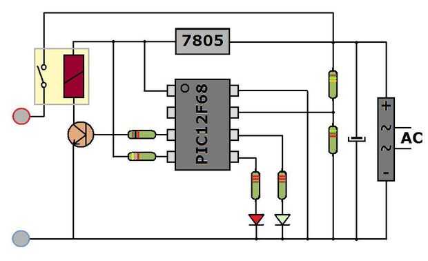 Al principio quería hacer de este un esquema analógico sólo, pero más tarde abandonó la idea. He decidido utilizar un PIC12F683 pequeña que he tenido en la acción de todos modos. Ya estaba familiarizado con este procesador, he usado como una unidad de control en muchos de mis proyectos, incluyendo el bloqueo de un hilo. Esta vez necesitaba dos LED salidas, una salida de relé transistor de conducción y una entrada de pulsador, para que la cuenta de perno demostró para ser más apropiada.