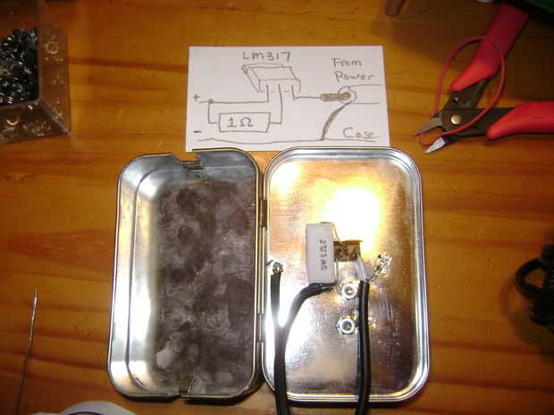 Cable de la caja por el esquema. Asegúrese de que no tener ninguno de los pares de cables a la caja metálica. La caja metálica ya está conectada a uno de los pines del LM317. Repetición, no conecte nada a la caja de METAL.