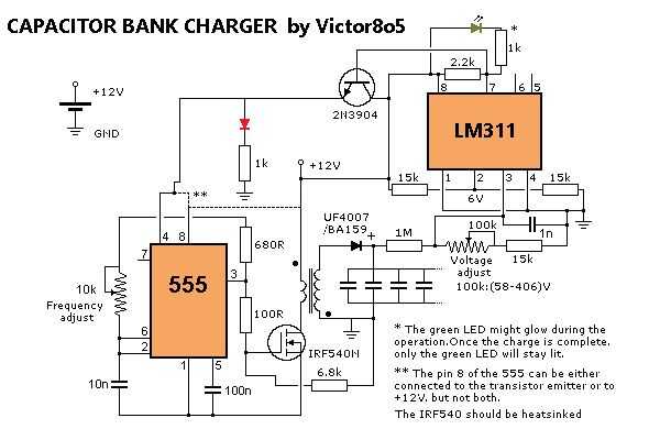 Si estás familiarizado con altos voltajes, sabrás que el 555 es un IC muy utilizado para crear una serie de pulsos de CC para ser alimentados en un MOSFET o un transistor para aumentar la corriente en los pulsos y paso a la tensión de un transformador. Este circuito hace apenas eso, pero también tiene un LM311, un comparador que detiene la operación de carga cuando se alcanza una cierta tensión en el Banco de capacitores.
