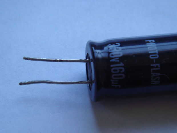 1. Inserte un condensador de 330 completamente descargadas en las puntas de la jeringa. Asegúrese de que el condensador tiene adecuada alineación polar con el cargador.