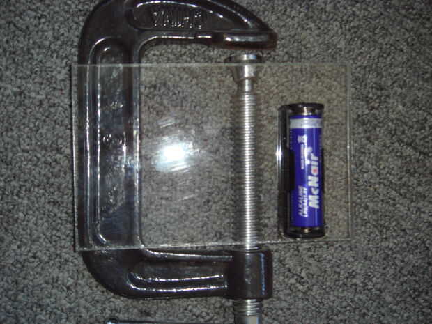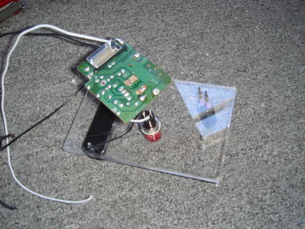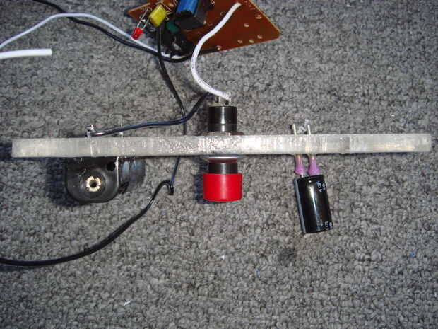 Ahora debe haber cuatro conexiones vacías en la placa de circuito, dos para la batería y dos para el condensador. La soldadura de una sección larga de pie de alambre en cada uno de estos agujeros vacíos.