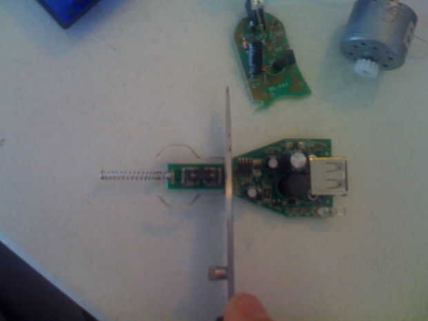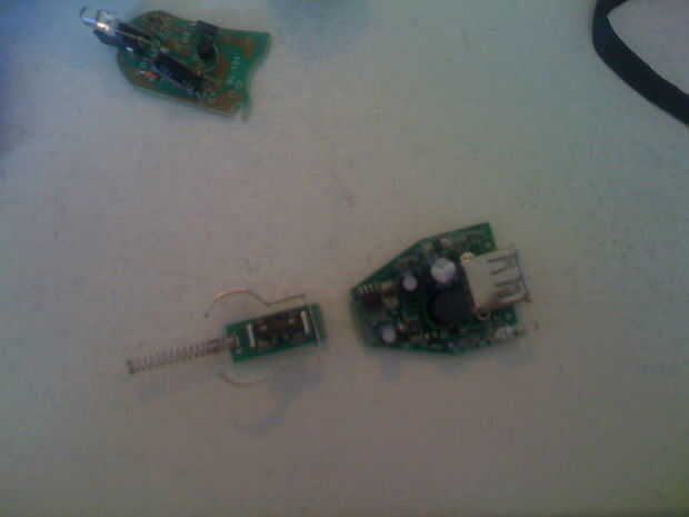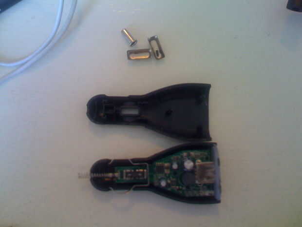 Para abrir el cargador USB, utilice un pequeño destornillador Phillips y destornille los 4 tornillos. Dos destornilladores de cabeza plana pueden el utilizar cuidadosamente pop abrir el caso. Ahora se mira de cerca, hay dos pequeñas conexiones punto aproximadamente 1/3 hacia abajo la placa de circuito (desde el lado de enchufe de 12V). Griffin podría han puesto estos dos agujeros en la placa para otro proyecto, pero en nuestro caso ellos trabajan mucho como punto de conexión para el generador. Un cuchillo y corte derecho tímido de este punto. Después de cortar el tablero. Mida y corte la caja negra también. no atornillar la parte posterior del caso todavía.