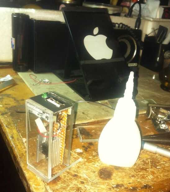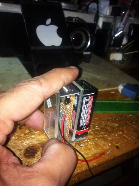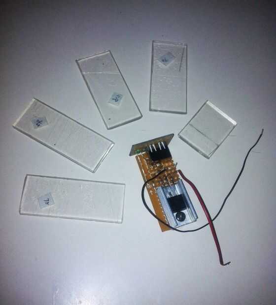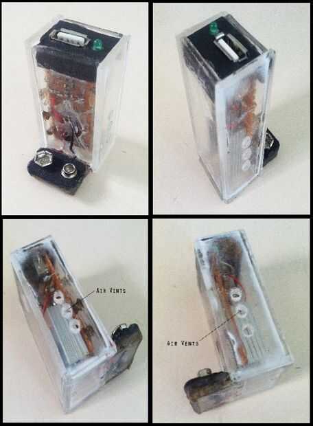 Después de varios minutos de ang corte raspado, es hora de montar con el chip de la pcb interior. Así que después de montaje y aplicación de un ajuste de los flexiglass mediante raspado con cuchillo exacto., pegué primero la parte delantera y trasera de la luneta, luego la parte izquierda y derecha de la luneta lo siguió y finalmente soldar el adaptador de batería de 9 voltios en la base extendida. Como se ve en la imagen, pongo algunos agujeros en el bisel, tres agujeros en cada lado y uno por debajo de la base, con la esperanza de ayudaría el disipador de calor para enfriamiento de sí mismo cuando calienta por LM 7805...