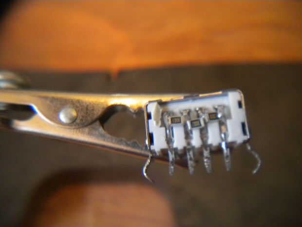 De la soldadura de las resistencias. Un buen juego de pinzas ayudará mucho. Tengo un par que cuando se aprieta, se abren; así que naturalmente tienen un elemento. Viró de un lado luego el otro. La diversión parte les tiene nivel en los pernos. No toque las resistencias con el hierro, sólo los pines del conector USB y deje que la soldadura fundida hagan su trabajo que fluye sobre el extremo de las resistencias.