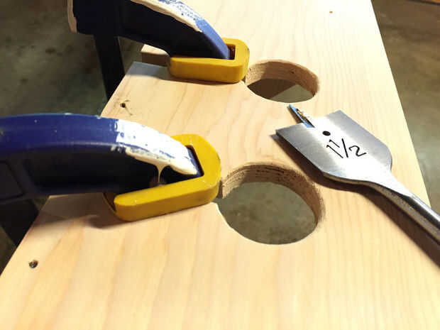 Para dar forma a los hoyos de llave, perforar una serie de agujeros con una broca de pala de 1-1/2". (Coloque un trozo de forro de madera en la parte inferior para evitar rasgaduras).