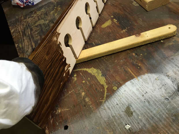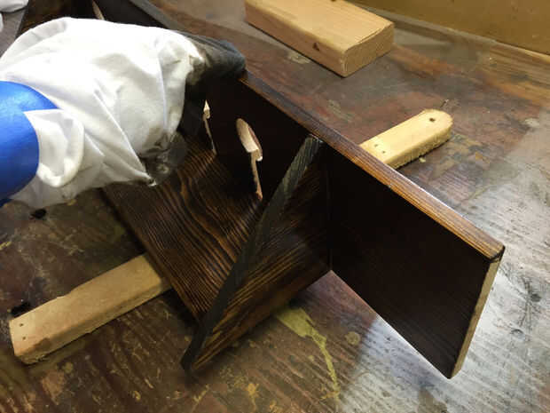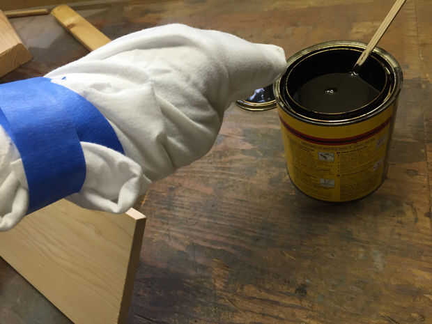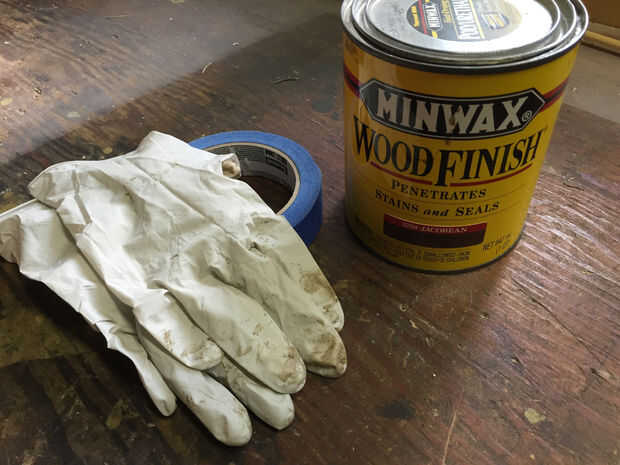Sugerencia: para aplicar el tinte, colóquese un guante de látex, luego envolver un paño alrededor de su mano. Cinta de la tela con cinta de enmascarar. Entonces sólo sumergir la mancha y frotarla en la madera. Es rápido y fácil de limpiar.