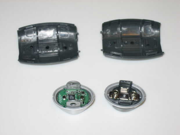 No desmonte el cargador usb. Es bastante estrecho hacia adelante. La tapa con los resortes aparece fácilmente retirar las pilas. La tapa restante se puede apalancar apagado con un destornillador o tirando de las dos mitades de la carcasa aparte. Lo que queremos es conseguir en el circuito interior de la tapa.