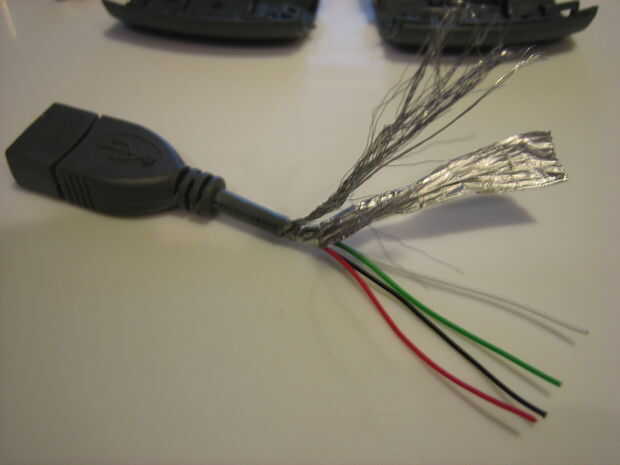 Abrir y separar los cables. Su interior típicamente encontrará, el blindaje, los cables de tierra y 4 alambres aislados en colores estándar de USB 7.Polarized Bermeja y blanco + verde de datos USB