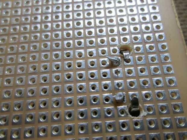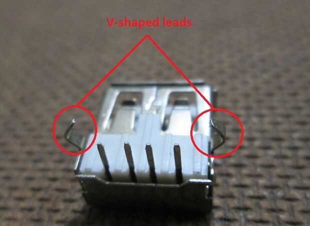-Aparte de los 4 terminales de USB, usted también encontrará dos plomos en forma de V en el conector. Estos normalmente no caben en el PCB y por lo tanto necesita verlas con la punta de tijeras. Sólo Inserte la punta de la tijera en el agujero y empezar girando, presionando en el PCB. Hacer esto hasta que el agujero ensancha bastante.