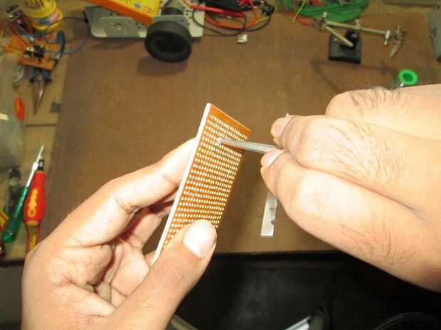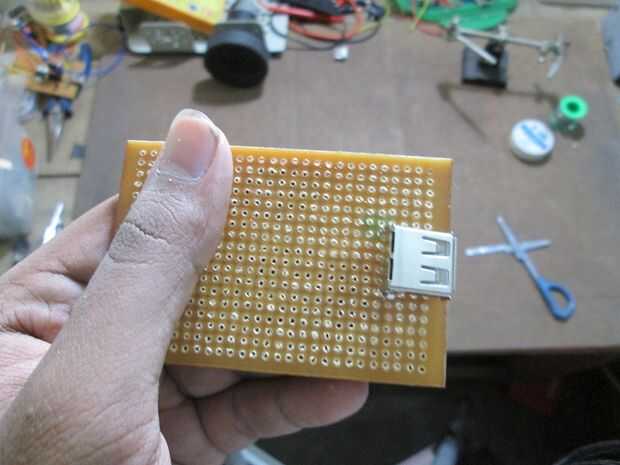 -Una vez que los agujeros son lo suficientemente anchos, conecte el conector USB para PCB y doblar las puntas en forma de V hacia la otra. Esto permitiría que el conector para sostener firmemente el PCB.