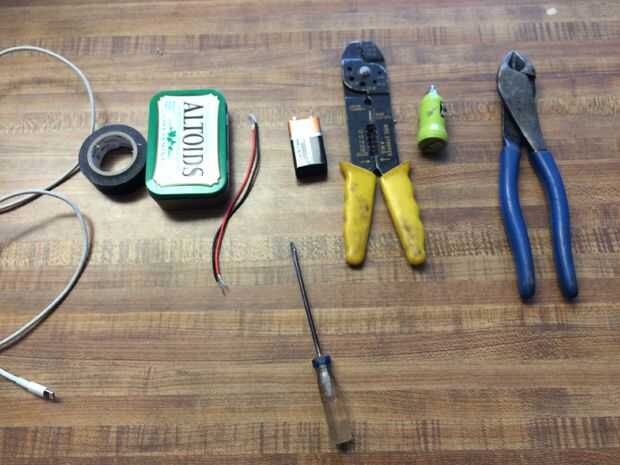Se necesita: una caja de menta altoids, cable positivo y negativo, cargador de coche USB, cinta aislante, cortadores de alambre, tornillo pequeño conductor, alicates, 9V batería 9V adaptador de batería, (opcional) y su cargador de teléfono.