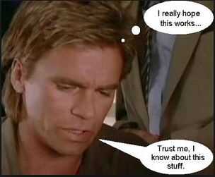 MacGyver, está en problemas, atado y atrapado en el sótano de un edificio y no fuera, una bomba de tiempo va a salir en una hora. Por supuesto él podría desactivar la bomba pero no habría ninguna explosión para ejecutarse desde el final del espectáculo. Él puede llamar a amigo Pet en su teléfono y le soltó, pero por supuesto hay un problema, la batería de los teléfonos es plana y no tiene un cargador. No importa allí es un ordenador viejo una copiadora de la foto y algunas herramientas.