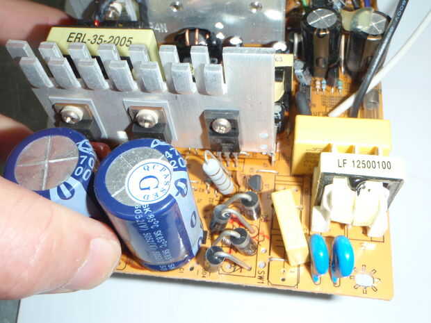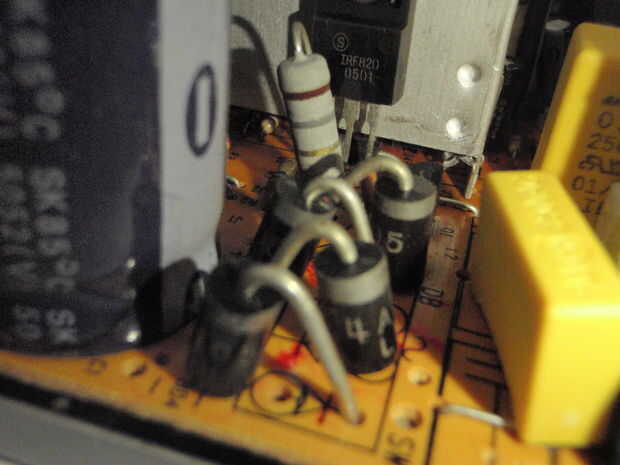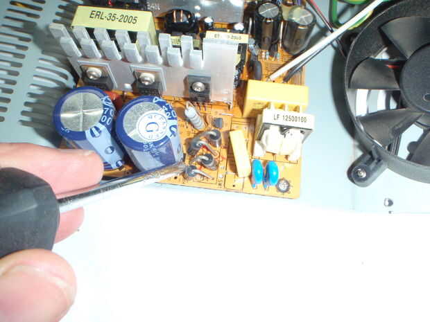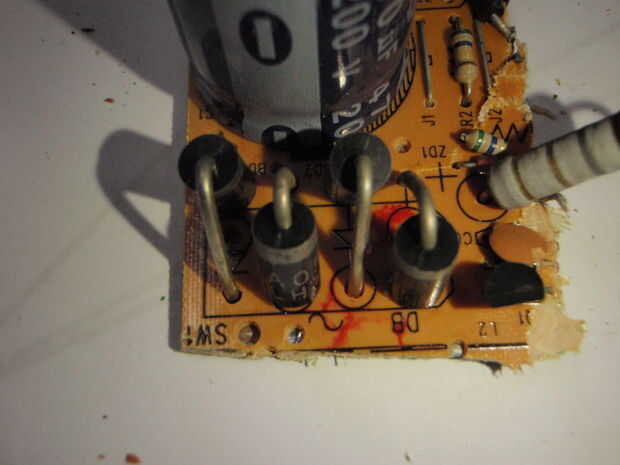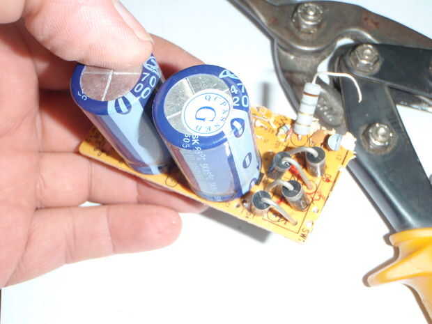 El puente rectificador parece cuatro diodos en paralelo y tiene un + y - los signos en cada extremo del tablero del circuito y también un par de ~ signos. Este se encuentra en la fuente de alimentación y otra vez corta la placa de circuito con unas tijeras.