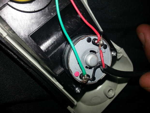 una vez que tenga su + y - los cables soldados al motor vas para cortar una muesca en el plástico para que el cable del teléfono celular del coche puede salir el caso con el caso aún de cierre. Sólo utiliza un cuchillo exato y corte una ranura donde el cable naturalmente venía por el lado de la caja.