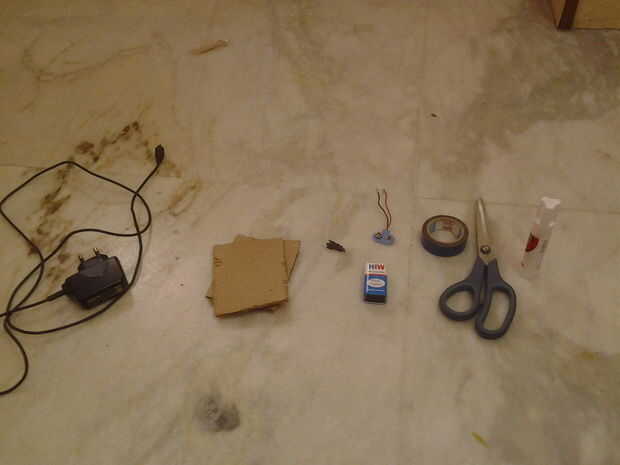 Para hacer este cargador necesita los siguientes elementos 1. el cargador de repuesto o usb 2. cartón 3. interruptor 4. un muelle de batería 5. una vieja batería de 9v con menos energía 6. cinta 7. tijeras 8. y pegamento
