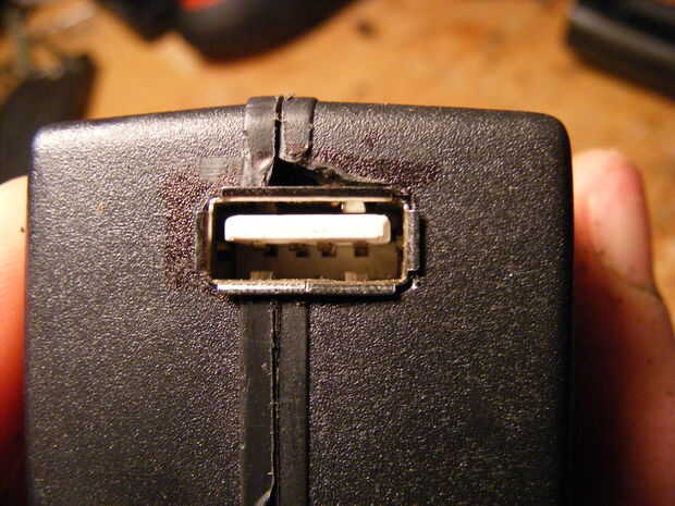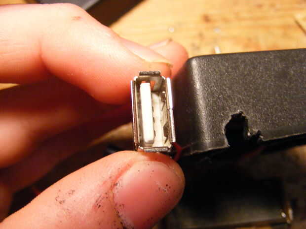 para cortar el orificio en el caso usé una dremel con el disco de papel. Esto permite una abertura para el conector usb. Si intenta encontrar el conector hembra usb, intente explorar antigua madre tarjetas y hubs usb.
