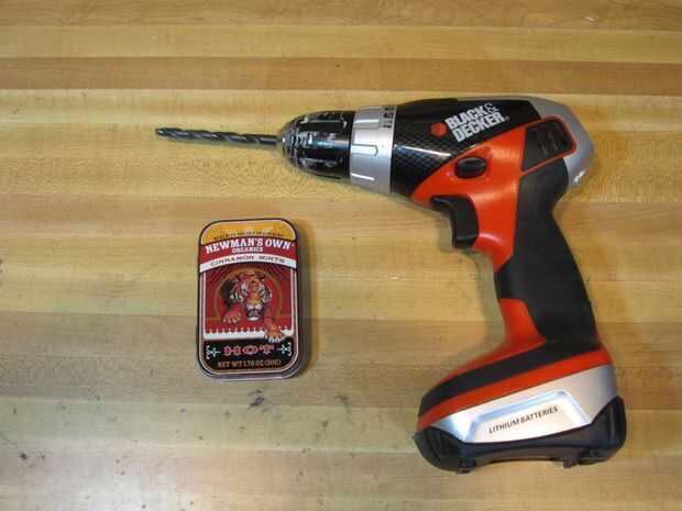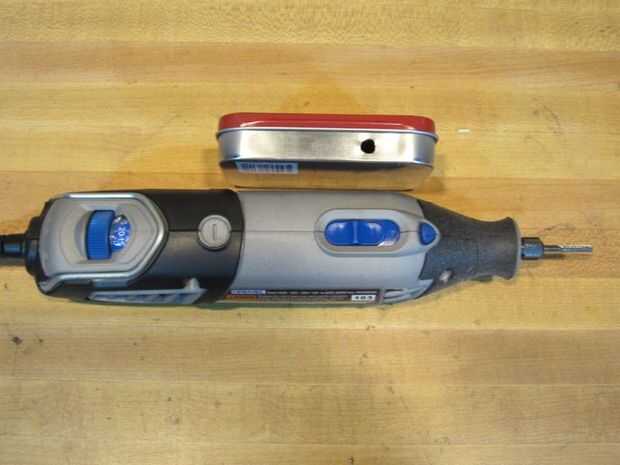 Cuando taladre una lata que hay que tener cuidado. Empujar demasiado duro y su lata obtiene doblada fuera de forma. El mejor Consejo que puedo dar es no empujar duro. Deje que el Taladro broca haga el trabajo para usted.