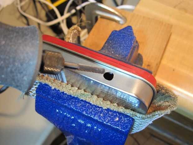 También usé un agarre del tornillo de banco para sostener la lata hacia abajo durante la perforación. Esto no siempre es necesario, pero puede ser muy útil.