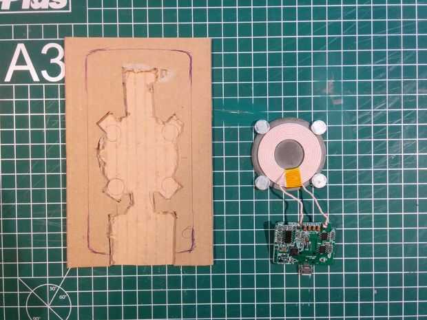 Empieza trazando los bordes del teléfono en la cartulina, luego coloque el cargador sin hilos dentro de los bordes trazados en la misma posición como sería en el teléfono y luego trazar alrededor de la bobina e imanes (el palo de imanes a la placa de soporte de la bobina por sí mismos).