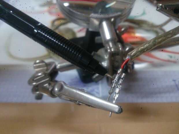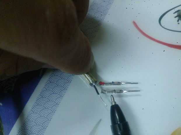 Ahora ponemos la cabeza de pines en los cables rojo y negro. Enganche funda de los cables y suelde el alambre a los pernos con una pluma en mi foto de arriba.