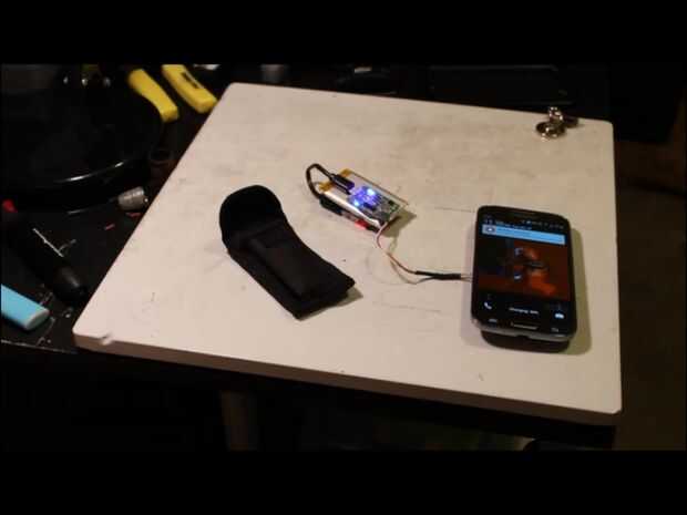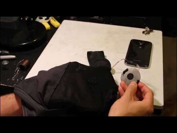 • Desea que el botón alinear con el pad recibe en su teléfono cuando usted pone en su bolsillo. Una vez que esa posición averiguada, coser un Velcro en el bolsillo en esa posición. Pegar el otro lado del Velcro a la plataforma de carga. Probarlo: adhiera la almohadilla al Velcro en su bolsillo. Luego coloque el teléfono en tu bolsillo y comprobar si se está cargando. También puede coser un elástico en su bolsillo para sostener mejor el teléfono en su lugar si se mueve mientras camina.