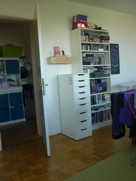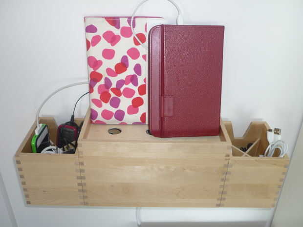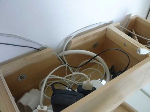 Los cables dentro de la caja se reunieron junto con un poco de alambre recubierto de plástico para que no vayan por todo el lugar cuando se levanta la tapa. La tapa va en al lado profundo de la caja, por lo que los dispositivos pueden estar apoyados contra la pared y no se deslizarán sobre el borde.